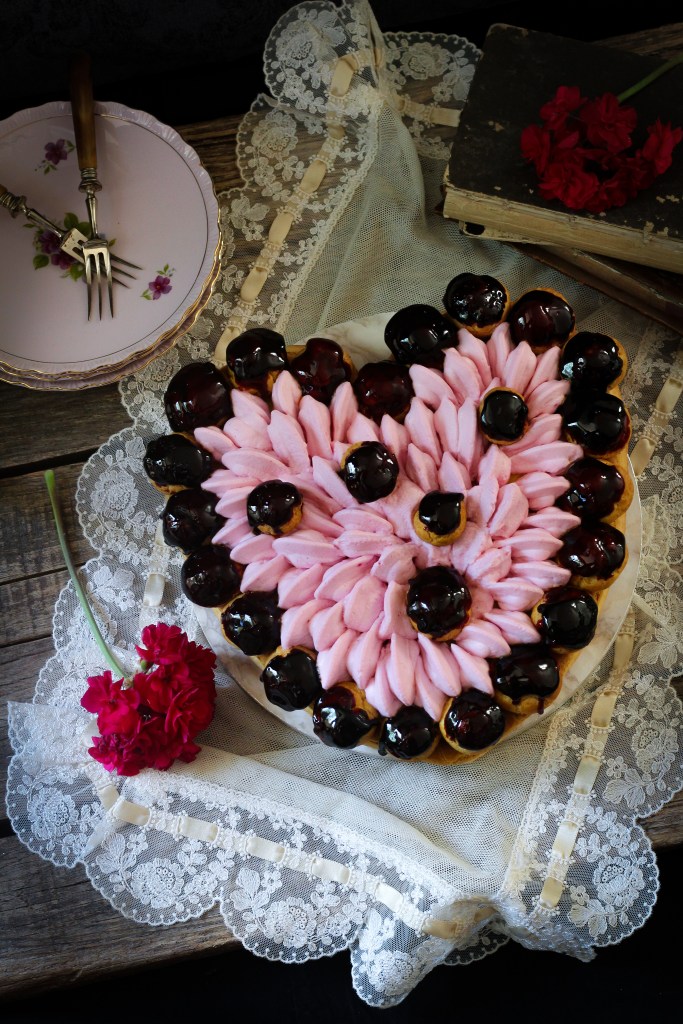 In pochi casi come in quello della Torta Saint Honorè, basta semplicemente pronunciare il suo nome per capire di quale meraviglia stiamo parlando.. non ha bisogno di nessuna presentazione! Si tratta infatti del fiore all’occhiello della pasticceria francese,un dolce regale costituito da pasta choux alla quale si aggiunge una base fragrante di sfoglia e una farcitura unica e golosa di crema chiboust (crema pasticcera alleggerita da meringa),il tutto impreziosito da un elegante decorazione di bignè ripieni.ll dolce è dedicato a Saint Honoré, più precisamente a San Onorato di Amiens, vescovo della città francese vissuto tra il 500 e il 600 dopo Cristo e santo patrono dei pasticceri e dei panettieri francesi:a lui è dedicata una via molto importante di Parigi e intorno al XV secolo vicino alla chiesa intitolata al suo nome si radunava la corporazione degli stessi pasticceri. La sua invenzione avvenne nel 1847 ad opera del pasticcere Chiboust(proprio la persona che ha dato il nome alla crema che si usa per la torta),collaborando con Auguste Julien, che ideò la ricetta, e con Fauvel, che realizzò la pasta per dolci “genoise”.La fusione di idee fu alla base del dolce che oggi conosciamo tutti, con la sua inconfondibile base friabile di pasta sfoglia, la pasta choux adagiata sopra e l’interno a base di crema Chiboust, la cui densità è data dagli albumi montati a neve. La corona di bignè che avvolge la torta giunse solo più tardi con l’invenzione della sac a poche.La bottega di Chiboust si trovava proprio sulla Rue Saint – Honorè, intitolata al vescovo di Amies. La torta Saint Honorè è sontuosa, elegante,raffinata e scenografica, è la torta dei compleanni o delle grandi occasioni e quale miglior occasione per prepararla ,se non la festa della mamma!? Questa torta la dedico a lei e all’immenso amore che provo ,e per questo che ho deciso di realizzarla non nelle solita forma circolare ,ma a forma di cuore. Per realizzare questa torta ho mantenuto la base tradizionale di pasta sfoglia su cui ho adagiato la pasta choux, le ho cotte insieme e a cottuta ultimata ho riempito gli spazi vuoti della base con confettura di lamponi.Ho poi farcito con una deliziosa crema chiboust alla vaniglia e ho decorato con una crema al mascarpone e panna aromatizzata al lampone e infine ho realizzato una corona di bignè farciti con crema chibouste e intinti nel caramello colorato di rosso. Il risultato è una torta dalle consistenze diverse dai sapori sublimi, morbida e croccante al tempo stesso ,profumata e delicata…si scioglie in bocca! Un vero assaggio di Paradiso! E’ un dolce piuttosto articolato e per questo vi consiglio di preparare in anticipo le diverse preparazioni,ma che vale la paena preparare perchè ad ogni fetta,il suo sapore vi ripagherà del lavoro svolto.
